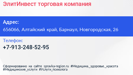 ЭлитИнвест, торговая компания по адресу 656066, Алтайский край, Барнаул, Новгородская, 26 в дальнейшем Организация, размещена в следующих категориях: