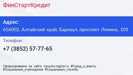 ФинСтартКредит по адресу 656002, Алтайский край, Барнаул, проспект Ленина, 101 в дальнейшем Организация, размещена в следующих категориях: