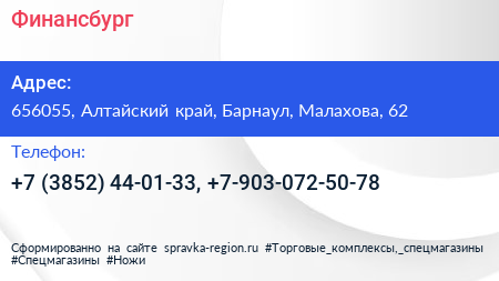 Финансбург по адресу 656055, Алтайский край, Барнаул, Малахова, 62 в дальнейшем Организация, размещена в следующих категориях: