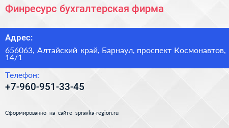 Финресурс, бухгалтерская фирма по адресу 656063, Алтайский край, Барнаул, проспект Космонавтов, 14/1 в дальнейшем Организация, размещена в следующих категориях:
