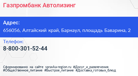 Газпромбанк Автолизинг по адресу 656056, Алтайский край, Барнаул, площадь Баварина, 2 в дальнейшем Организация, размещена в следующих категориях: