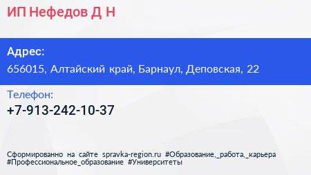 ИП Нефедов Д.Н. по адресу 656015, Алтайский край, Барнаул, Деповская, 22 в дальнейшем Организация, размещена в следующих категориях: