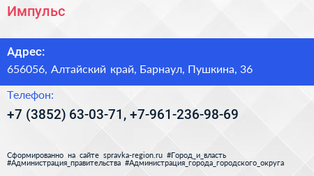Импульс по адресу 656056, Алтайский край, Барнаул, Пушкина, 36 в дальнейшем Организация, размещена в следующих категориях: