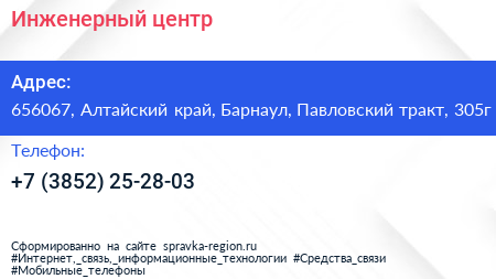 Инженерный центр по адресу 656067, Алтайский край, Барнаул, Павловский тракт, 305г в дальнейшем Организация, размещена в следующих категориях: