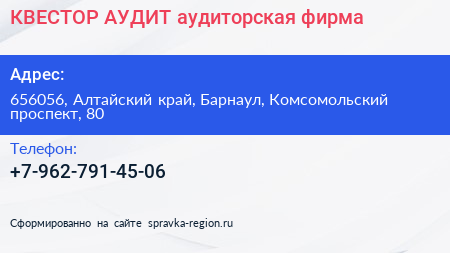 КВЕСТОР-АУДИТ, аудиторская фирма по адресу 656056, Алтайский край, Барнаул, Комсомольский проспект, 80 в дальнейшем Организация, размещена в следующих категориях: