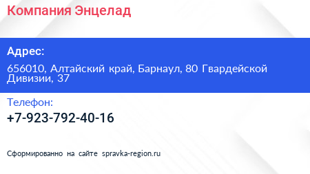 Компания Энцелад по адресу 656010, Алтайский край, Барнаул, 80 Гвардейской Дивизии, 37 в дальнейшем Организация, размещена в следующих категориях: