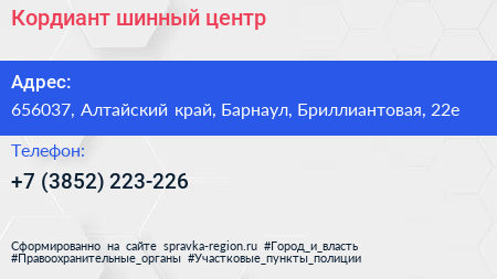 Кордиант, шинный центр по адресу 656037, Алтайский край, Барнаул, Бриллиантовая, 22е в дальнейшем Организация, размещена в следующих категориях: