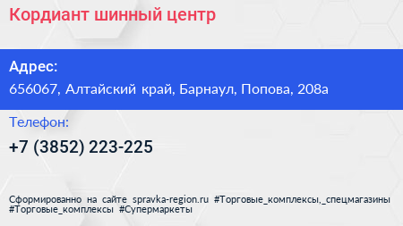 Кордиант, шинный центр по адресу 656067, Алтайский край, Барнаул, Попова, 208а в дальнейшем Организация, размещена в следующих категориях: