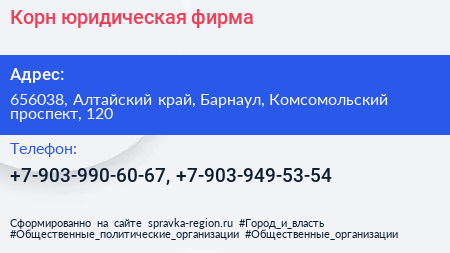 Корн, юридическая фирма по адресу 656038, Алтайский край, Барнаул, Комсомольский проспект, 120 в дальнейшем Организация, размещена в следующих категориях: