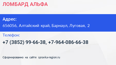 ЛОМБАРД АЛЬФА по адресу 656056, Алтайский край, Барнаул, Луговая, 2 в дальнейшем Организация, размещена в следующих категориях: