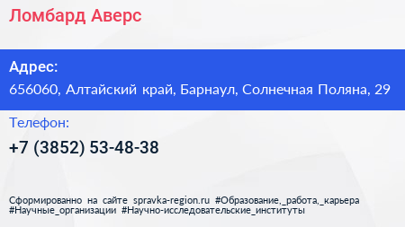 Ломбард Аверс по адресу 656060, Алтайский край, Барнаул, Солнечная Поляна, 29 в дальнейшем Организация, размещена в следующих категориях: