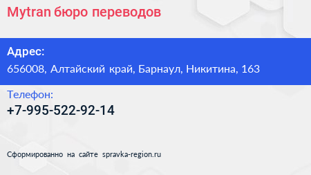 Mytran, бюро переводов по адресу 656008, Алтайский край, Барнаул, Никитина, 163 в дальнейшем Организация, размещена в следующих категориях: