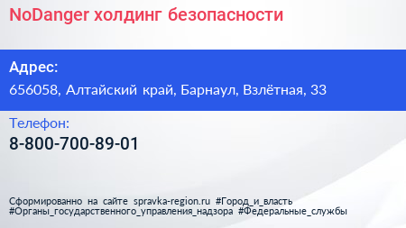 NoDanger, холдинг безопасности по адресу 656058, Алтайский край, Барнаул, Взлётная, 33 в дальнейшем Организация, размещена в следующих категориях: