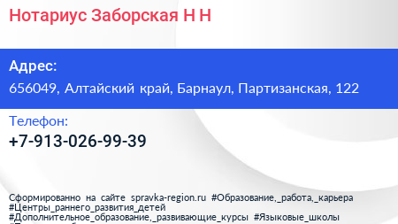 Нотариус Заборская Н.Н. по адресу 656049, Алтайский край, Барнаул, Партизанская, 122 в дальнейшем Организация, размещена в следующих категориях: