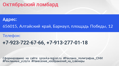 Октябрьский, ломбард по адресу 656015, Алтайский край, Барнаул, площадь Победы, 12 в дальнейшем Организация, размещена в следующих категориях: