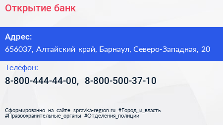 Открытие, банк по адресу 656037, Алтайский край, Барнаул, Северо-Западная, 20 в дальнейшем Организация, размещена в следующих категориях: