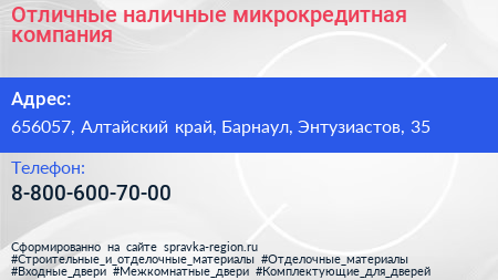 Отличные наличные, микрокредитная компания по адресу 656057, Алтайский край, Барнаул, Энтузиастов, 35 в дальнейшем Организация, размещена в следующих категориях: