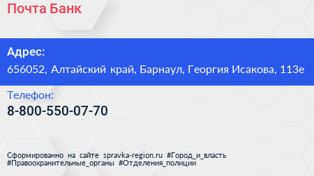 Почта Банк по адресу 656052, Алтайский край, Барнаул, Георгия Исакова, 113е в дальнейшем Организация, размещена в следующих категориях: