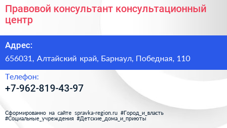 Правовой консультант, консультационный центр по адресу 656031, Алтайский край, Барнаул, Победная, 110 в дальнейшем Организация, размещена в следующих категориях: