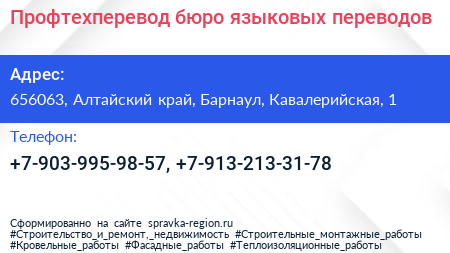 Профтехперевод, бюро языковых переводов по адресу 656063, Алтайский край, Барнаул, Кавалерийская, 1 в дальнейшем Организация, размещена в следующих категориях: