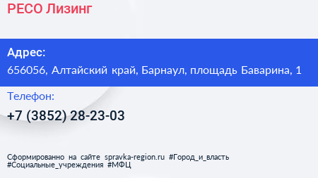 РЕСО-Лизинг по адресу 656056, Алтайский край, Барнаул, площадь Баварина, 1 в дальнейшем Организация, размещена в следующих категориях:
