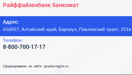 Райффайзенбанк, банкомат по адресу 656057, Алтайский край, Барнаул, Павловский тракт, 251в в дальнейшем Организация, размещена в следующих категориях: