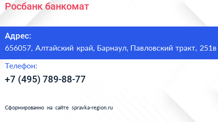 Росбанк, банкомат по адресу 656057, Алтайский край, Барнаул, Павловский тракт, 251в в дальнейшем Организация, размещена в следующих категориях: