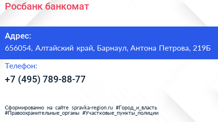 Росбанк, банкомат по адресу 656054, Алтайский край, Барнаул, Антона Петрова, 219Б в дальнейшем Организация, размещена в следующих категориях: