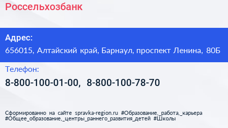 Россельхозбанк по адресу 656015, Алтайский край, Барнаул, проспект Ленина, 80Б в дальнейшем Организация, размещена в следующих категориях: