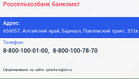 Россельхозбанк, банкомат по адресу 656057, Алтайский край, Барнаул, Павловский тракт, 251в в дальнейшем Организация, размещена в следующих категориях: