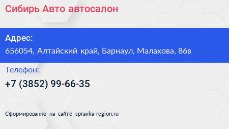 Сибирь Авто, автосалон по адресу 656054, Алтайский край, Барнаул, Малахова, 86в в дальнейшем Организация, размещена в следующих категориях: