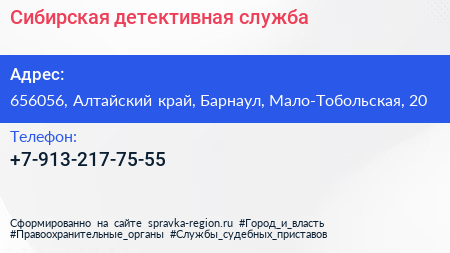 Сибирская детективная служба по адресу 656056, Алтайский край, Барнаул, Мало-Тобольская, 20 в дальнейшем Организация, размещена в следующих категориях: