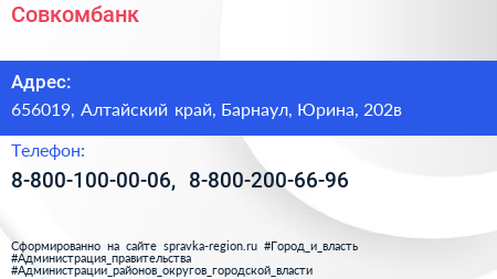 Совкомбанк по адресу 656019, Алтайский край, Барнаул, Юрина, 202в в дальнейшем Организация, размещена в следующих категориях: