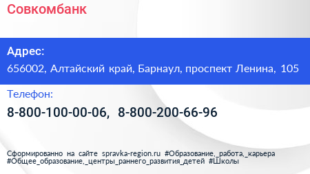 Совкомбанк по адресу 656002, Алтайский край, Барнаул, проспект Ленина, 105 в дальнейшем Организация, размещена в следующих категориях: