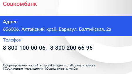 Совкомбанк по адресу 656006, Алтайский край, Барнаул, Балтийская, 2а в дальнейшем Организация, размещена в следующих категориях: