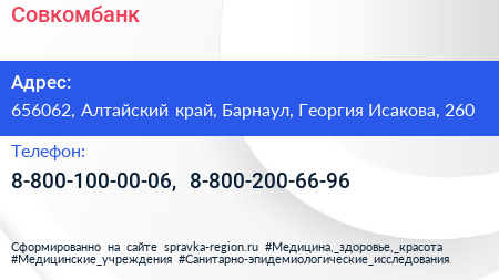 Совкомбанк по адресу 656062, Алтайский край, Барнаул, Георгия Исакова, 260 в дальнейшем Организация, размещена в следующих категориях: