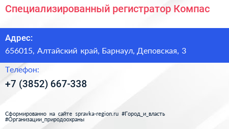Специализированный регистратор Компас по адресу 656015, Алтайский край, Барнаул, Деповская, 3 в дальнейшем Организация, размещена в следующих категориях: