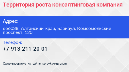 Территория роста, консалтинговая компания по адресу 656038, Алтайский край, Барнаул, Комсомольский проспект, 120 в дальнейшем Организация, размещена в следующих категориях: