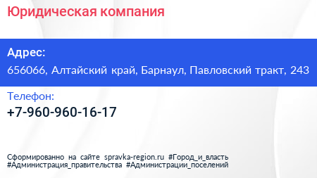 Юридическая компания по адресу 656066, Алтайский край, Барнаул, Павловский тракт, 243 в дальнейшем Организация, размещена в следующих категориях:
