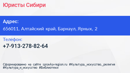 Юристы Сибири по адресу 656011, Алтайский край, Барнаул, Ярных, 2 в дальнейшем Организация, размещена в следующих категориях: