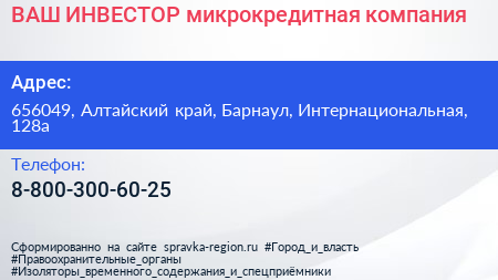 ВАШ ИНВЕСТОР, микрокредитная компания по адресу 656049, Алтайский край, Барнаул, Интернациональная, 128а в дальнейшем Организация, размещена в следующих категориях: