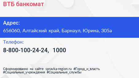 ВТБ, банкомат по адресу 656060, Алтайский край, Барнаул, Юрина, 305а в дальнейшем Организация, размещена в следующих категориях: