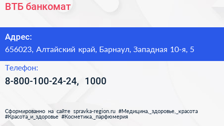 ВТБ, банкомат по адресу 656023, Алтайский край, Барнаул, Западная 10-я, 5 в дальнейшем Организация, размещена в следующих категориях: