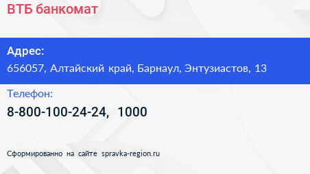 ВТБ, банкомат по адресу 656057, Алтайский край, Барнаул, Энтузиастов, 13 в дальнейшем Организация, размещена в следующих категориях: