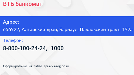 ВТБ, банкомат по адресу 656922, Алтайский край, Барнаул, Павловский тракт, 192а в дальнейшем Организация, размещена в следующих категориях: