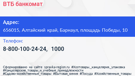 ВТБ, банкомат по адресу 656015, Алтайский край, Барнаул, площадь Победы, 10 в дальнейшем Организация, размещена в следующих категориях: