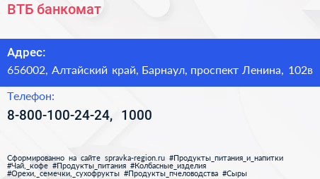 ВТБ, банкомат по адресу 656002, Алтайский край, Барнаул, проспект Ленина, 102в в дальнейшем Организация, размещена в следующих категориях: