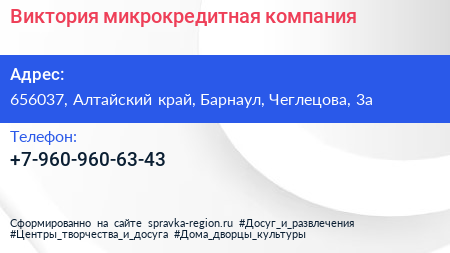 Виктория, микрокредитная компания по адресу 656037, Алтайский край, Барнаул, Чеглецова, 3а в дальнейшем Организация, размещена в следующих категориях: