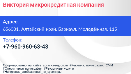 Виктория, микрокредитная компания по адресу 656031, Алтайский край, Барнаул, Молодёжная, 115 в дальнейшем Организация, размещена в следующих категориях: