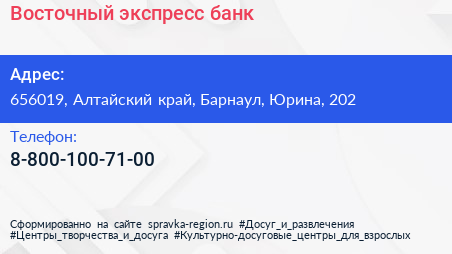 Восточный экспресс банк по адресу 656019, Алтайский край, Барнаул, Юрина, 202 в дальнейшем Организация, размещена в следующих категориях:
